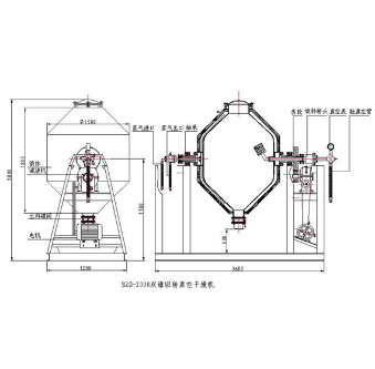 SZG雙錐回轉真空干燥機為雙錐形的回轉罐體,罐內在真空狀態下,向夾套內通入蒸汽或熱水進行加熱,熱量通過罐體內壁與濕物料接觸。濕物料吸熱后蒸發的水汽。通過真空泵經真空排氣管被抽走。由于罐體內處于真空狀態,且罐體的回轉使物料不斷的上下,內外翻動,故加快了物料的干燥速度,提高干燥效率,達到均勻干燥的目的。